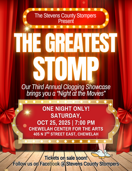 Get ready for an unforgettable evening of rhythm, energy, and entertainment as Melissa Johnson and the Stevens County Stompers present The Greatest Stomp! This third annual clogging showcase brings audiences a dazzling “Night at the Movies,” filled with fast-paced footwork and lively performances that will keep you tapping along. Join us for one night only on Saturday, October 25, 2025, at 7:00 pm at the Chewelah Center for the Arts. Admission is just $15, making this a perfect night out for families and friends to experience the joy of clogging and the magic of the movies. Don’t miss this high-energy celebration of dance and community spirit!